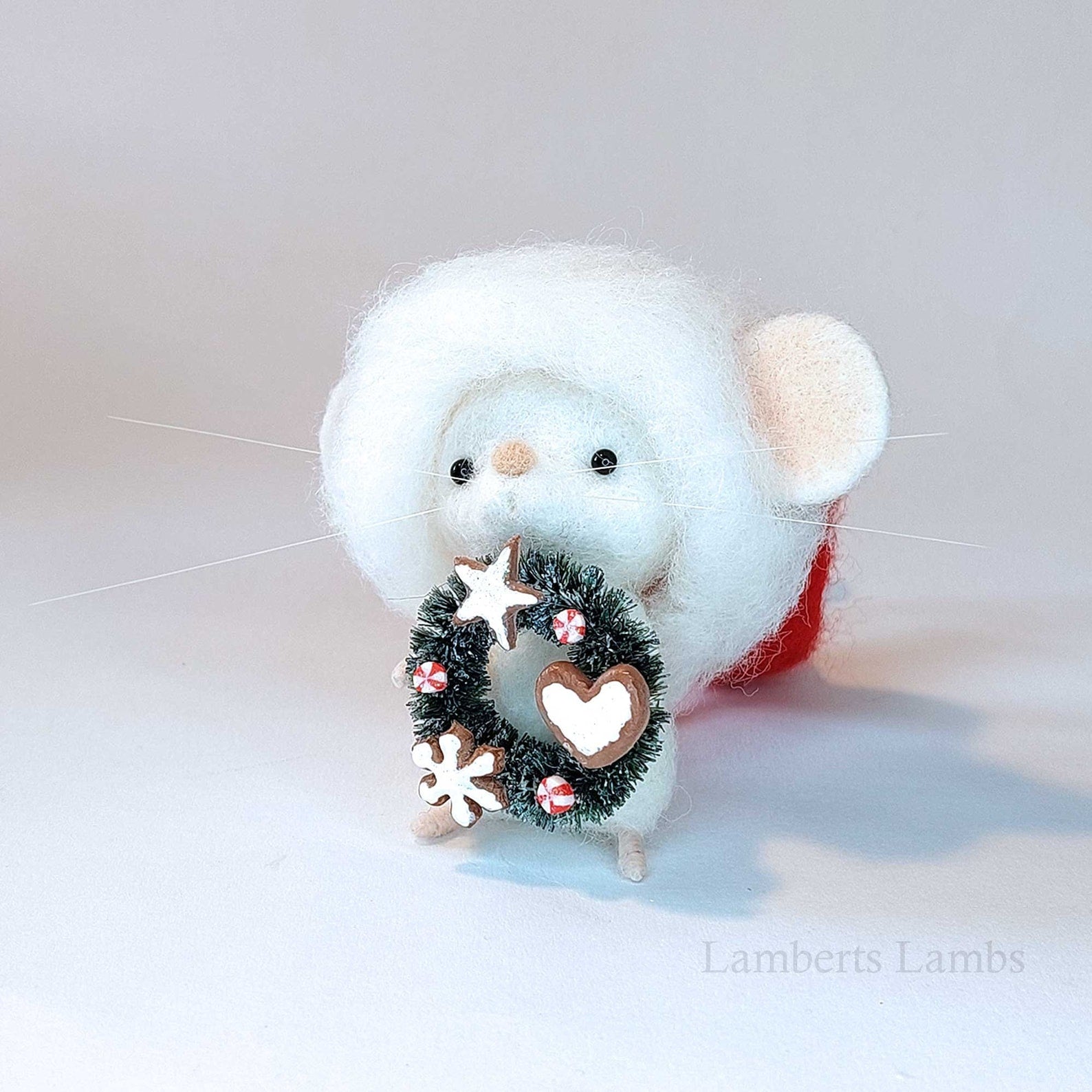 Adorable needle felted Christmas mouse in a Santa hat holding a wreath decorated with cookies/ White wool felted mouse keepsake decoration