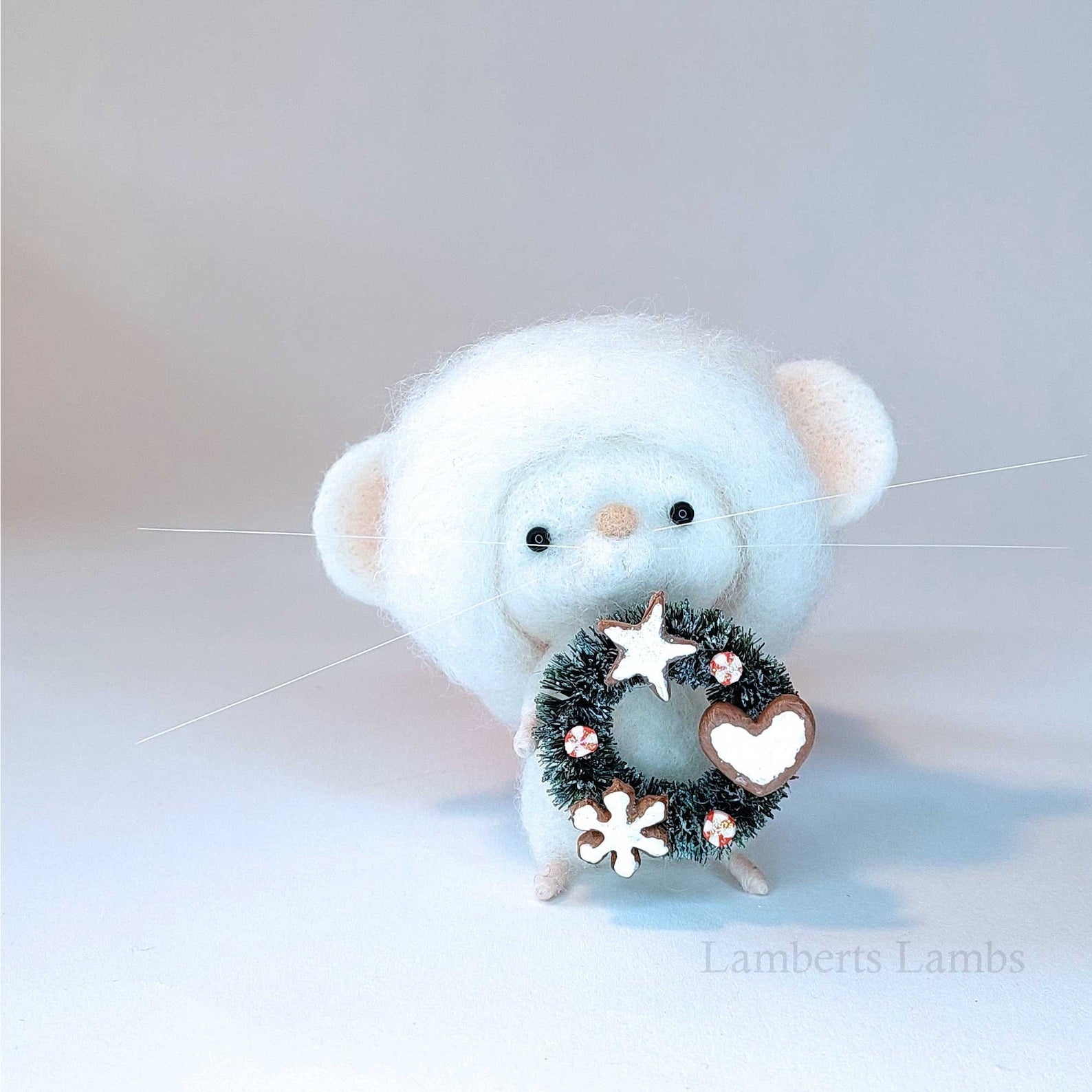 This cute handmade Santa felted mouse is made at my desk by stabbing sheep's wool with a barbed needle felted needle. The body of mouse has a wire armature which allows for some repositioning of its body. I make the cookies on the wreath by rolling, cutting, baking and decorating polymer clay.