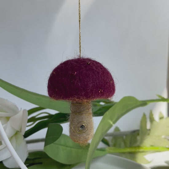 Burgundy needle felted mushroom, enchanted hanging mushroom bauble