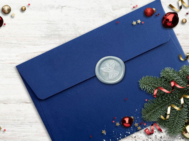 This wax seal is made in a 2 step process. First the angel seal is made, and then is cut out and replaced in the stamp. The stamp is then stamped again on hot wax to create the final wax seal.