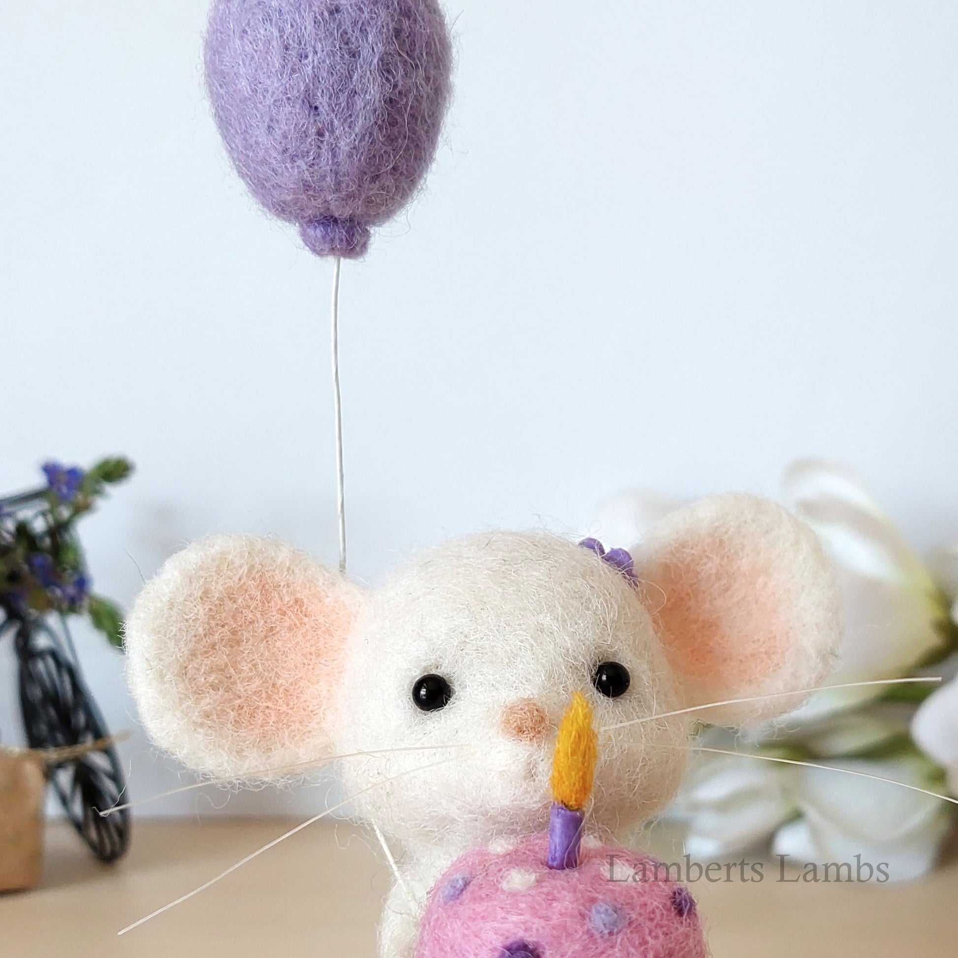 A cute needle felted mouse is ready for a Birthday Party. She has baked a chocolate cake decorated with pink icing and topped it with a purple candle and has blown up a purple balloon. For this special occasion she has put a pretty purple flower in her hair.