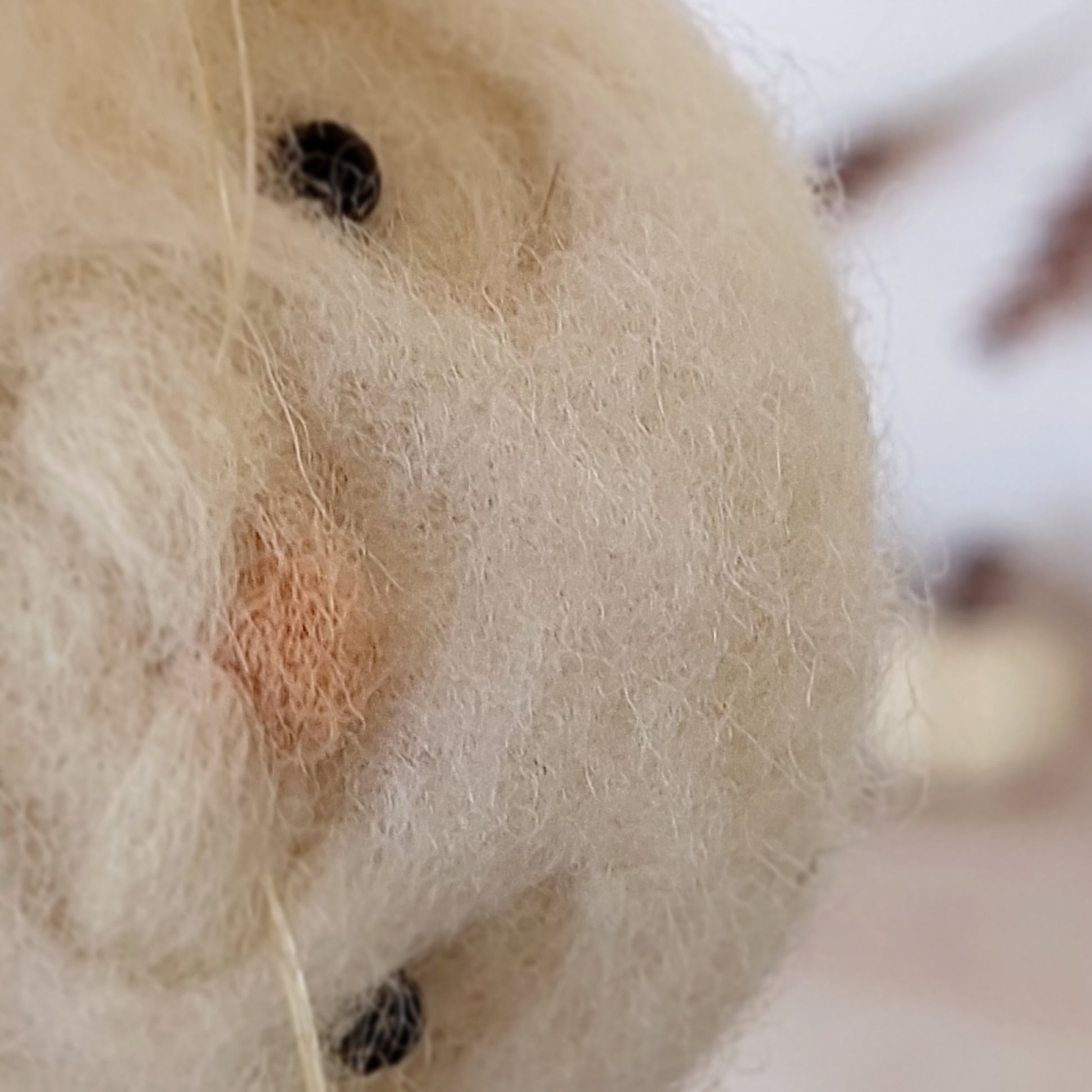 wool, wire, glue, glass eye, polymer clay, paint, varnish, micro powder