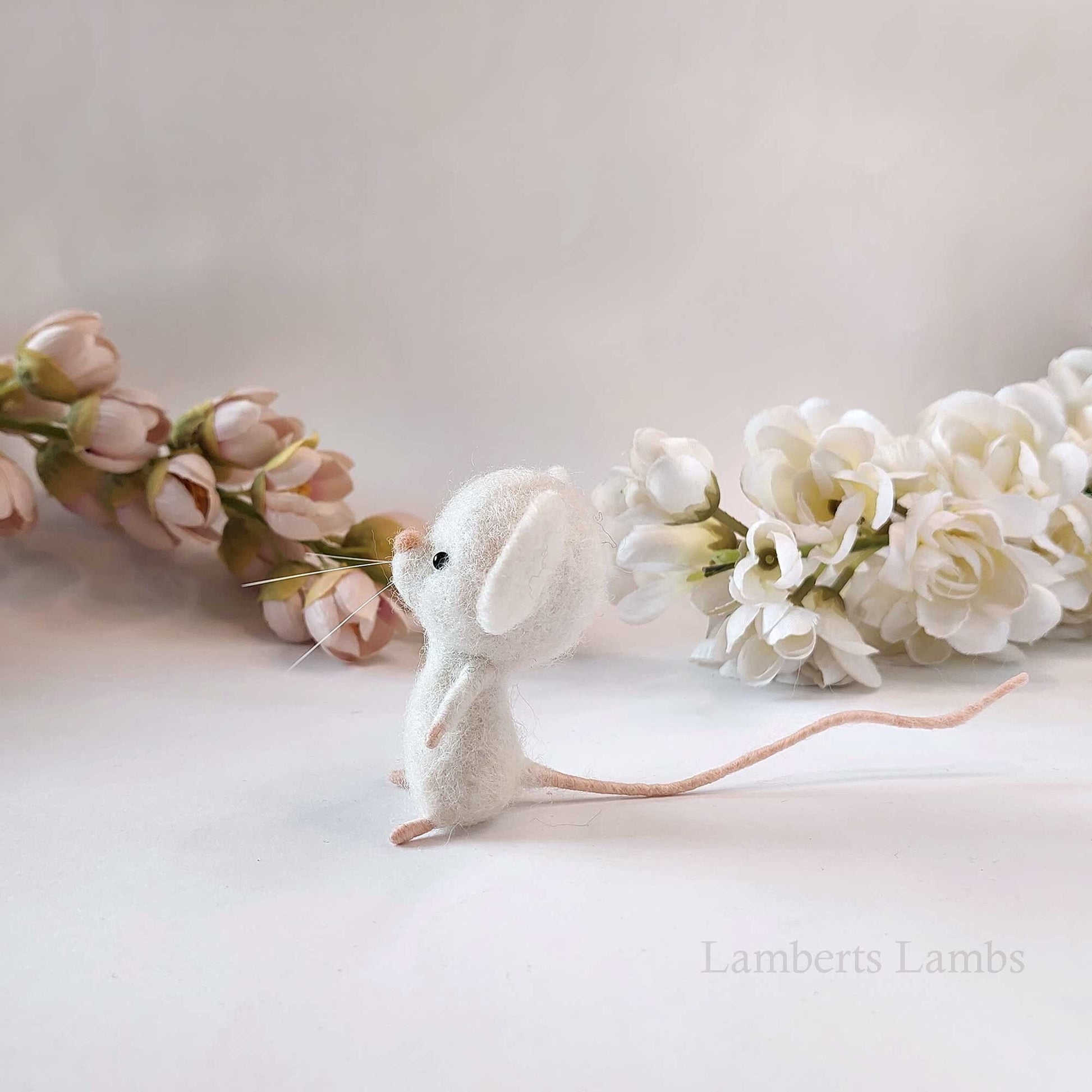 A cute little needle felted mouse. This white felted mouse is made by needle felting sheep wool onto a wire armature.
