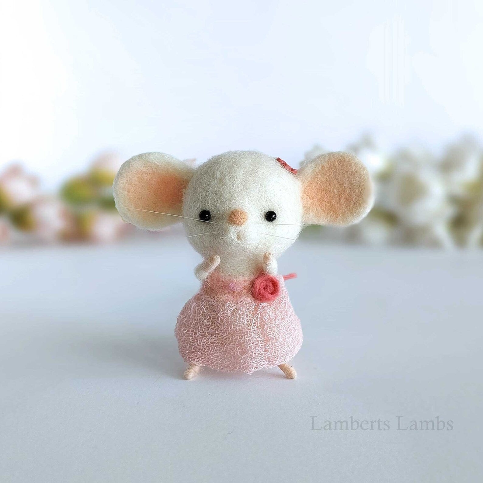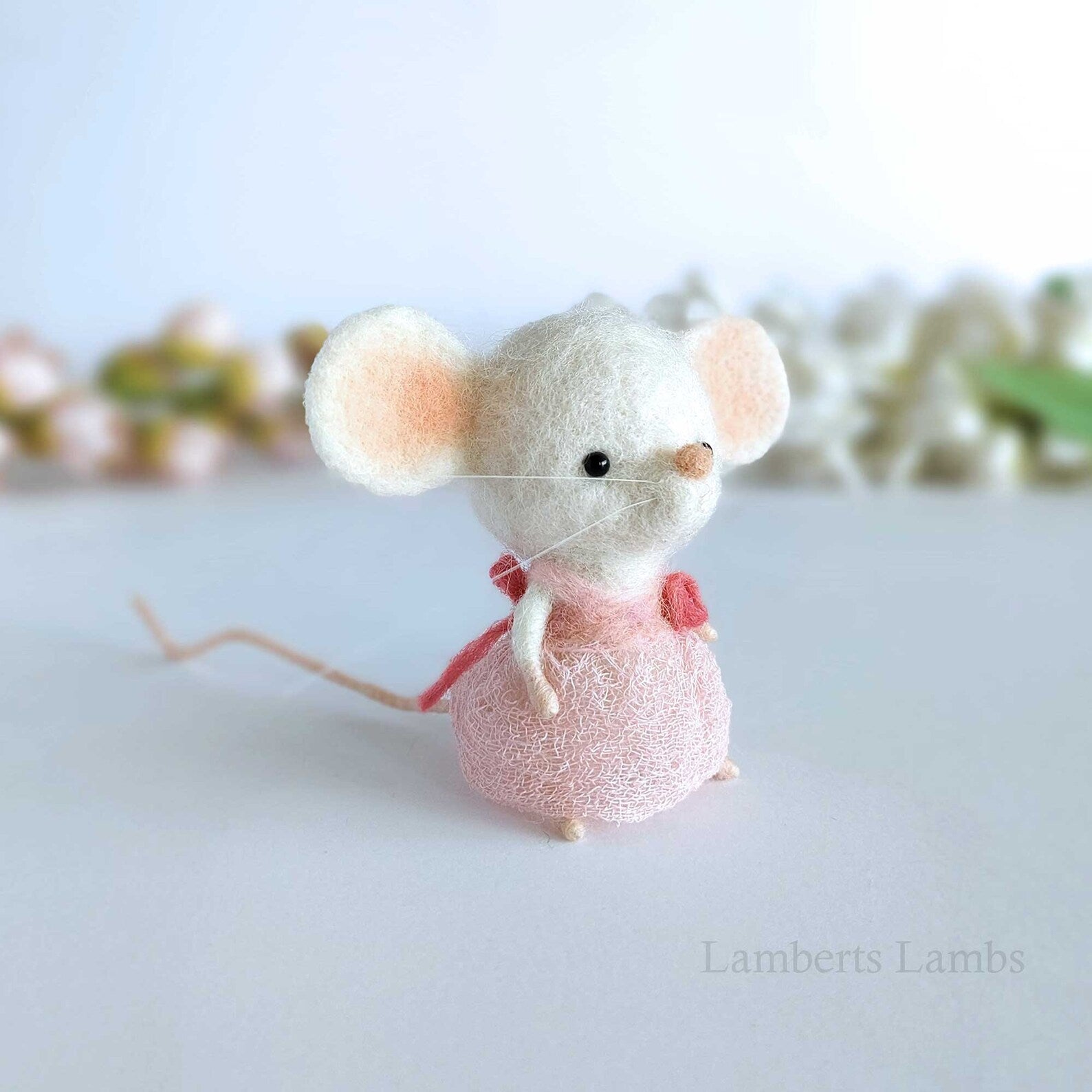 A cute little needle felted mouse. This white felted mouse is made by needle felting sheep wool onto a wire armature.
