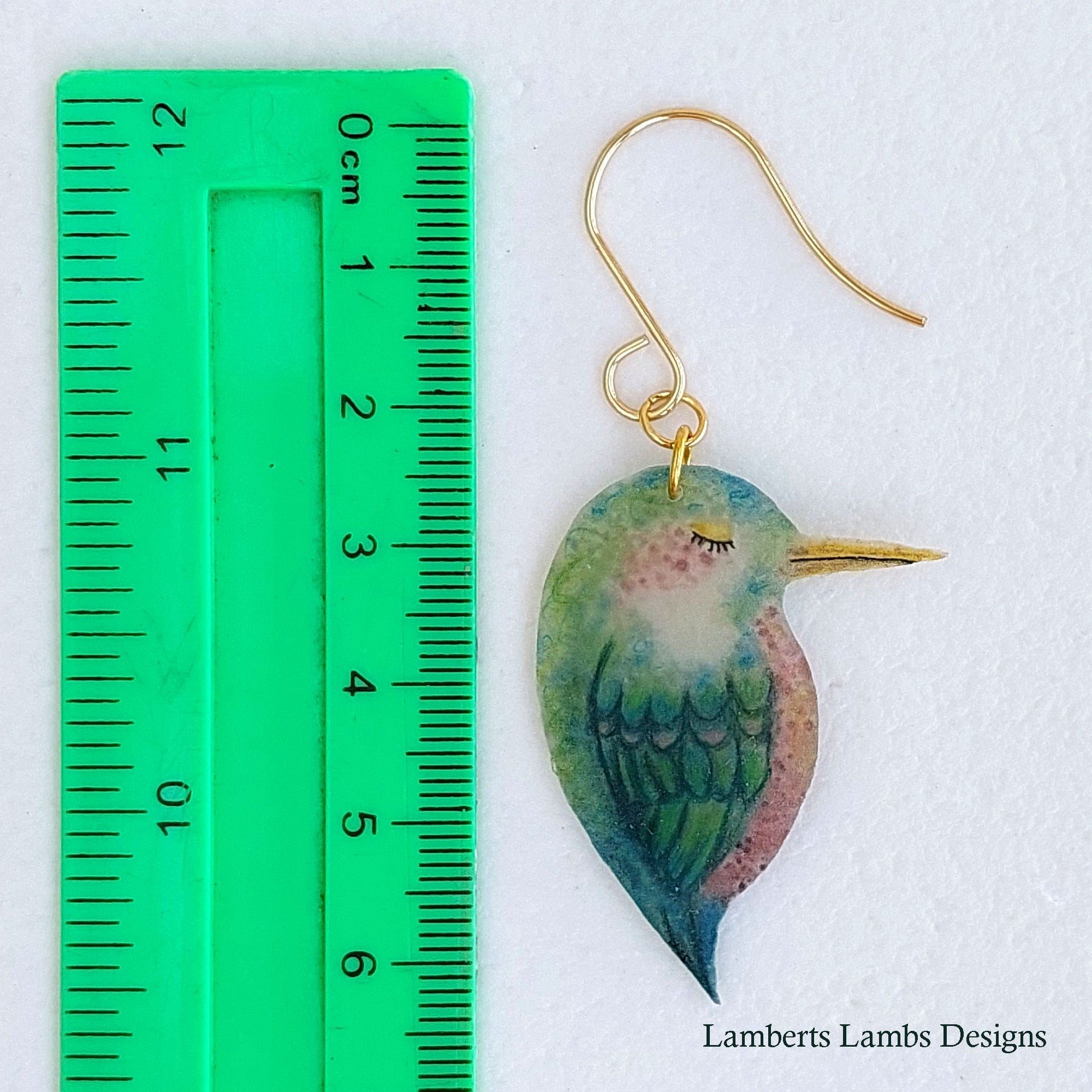 These handmade earrings are made from a combination of drawing the design on my computer, printing the base image on shrink plastic and then colouring them with a combination of Prisma colour pencils and permanent marker and then cutting out the shape. After colouring them, they are then shrunk in the oven. To give the material more hardiness they are then coated in UV resin, after which I attach the pendent to the earring hook. Being made of shrink plastic they are very light and do not weight down your earlobe.